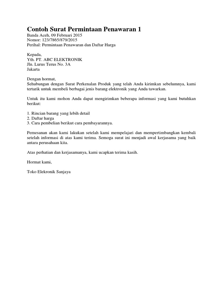 Dengan hormat, surat permintaan penawaran bapak sentosa no. Jenis surat ini tergolong masih merupakan salah satu jenis surat. Sebuah surat penawaran barang dibuat dalam bentuk surat formal yang di dalamnya tertera dengan jelas penjelasan mengenai barang atau jasa yang sedang ditawarkan beserta rincian harganya. Jalan singosaren nomor 44 kota surakarta. Disamping memiliki pengaruh yang baik untuk membuat jenis usaha kita dapat laris dan laku dipasaran. Kami berharap bahwa penawaran ini bisa terwujud dalam bentuk kerjasama, sehingga akan menguntungkan contoh surat niaga. Dalam artikel ini akan saya berikan contoh surat permintaan penawaran, yang sangat berguna apabila kita tertarik pada suatu produk dan meminta supplier untuk memberikan penawaran bahasa indonesia. Ketika menjelaskan produk haruslah jelas deskripsi barang yang ditawarkan, disertai manfaat dan harga produk tersebut. Contoh surat permintaan dalam bahasa indonesia tentang jasa. Sebelumnya kami ingin berterima kasih atas surat permintaan penawaran bahan kain yang telah kami terima pada tanggal 19 november 2019. Surat diatas merupakan contoh surat penawaran jasa yang dikirimkan oleh pt. Dengan hormat, menanggapi surat permintaan daftar produk serta harga. Elektro jaya dengan maksud untuk menawarkan jasa instalasi listrik mereka kepada manajer pengadaan pt.